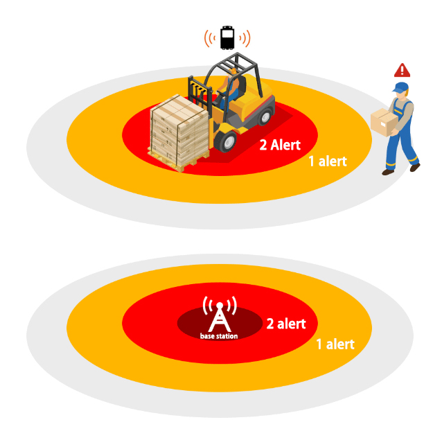 Sabo Forklift AI Anti Collision System: at level 1, AI camera detected pedestrains, it gets alert alarm. at level 2, when pedestrains keep going forward to forklift, it starts speed slow. at level 3, when pedestrains still going forwarder to forklift, it gets auto-brake.