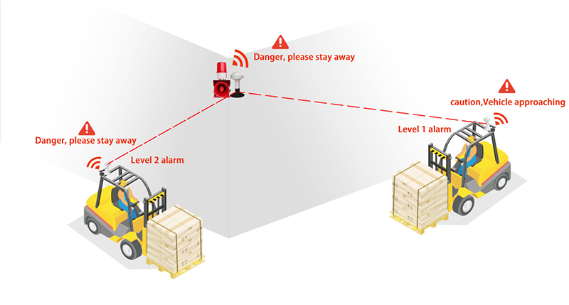 By installing the forklift blind zone collision avoidance system through real-time monitoring of obstacles around the forklift, using advanced UWB ranging technology to install the base station at the corner, the doorway blind zone, forklift roof mounted tags, when the forklift is close to the blind zone, will be voice alert in advance to help drivers accurately perceive the surrounding environment, eliminating the visual field of the blind zone, so as to effectively prevent and reduce the forklift collision accidents.