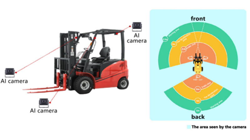 Utilize the image recognition, pedestrian detection and collision risk technology of the forklift AI collision avoidance system, high-precision camera to capture environmental information and real-time processing. Enhance the safety of forklift operation process, reduce the occurrence of collision accidents, and protect the safety of personnel, goods and equipment.