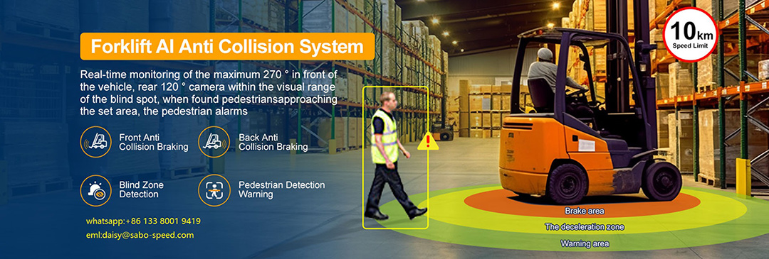 Sabo Forklift AI Anti Collision System: at level 1, AI camera detected pedestrains, it gets alert alarm. at level 2, when pedestrains keep going forward to forklift, it starts speed slow. at level 3, when pedestrains still going forwarder to forklift, it gets auto-brake.